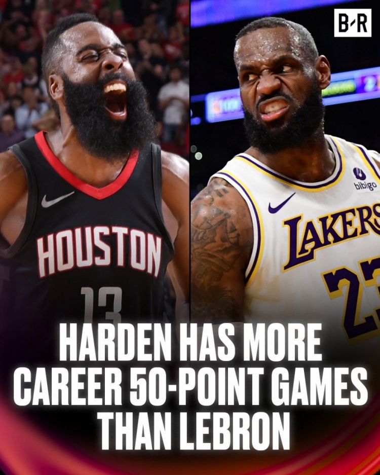 詹姆斯生涯共14次得分50+,而哈登已完成24次